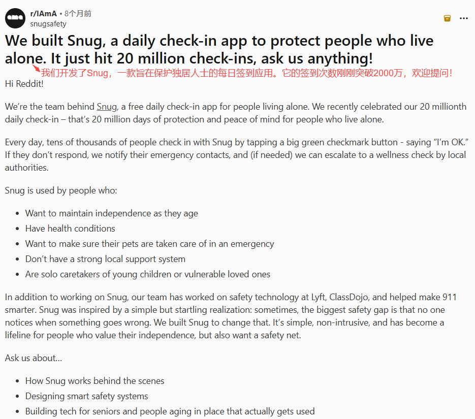 这种机制在规模化之后,必然要面对资源与效率的平衡问题。2025年5月,Snug Safety官方在Reddit发帖称,App每日签到人数已突破2000万。这一数据随即引发了用户追问:在如此庞大的基数下,忘记签到的用户数量有多少?这种体量的任务是否会导致调度员产生疏忽?