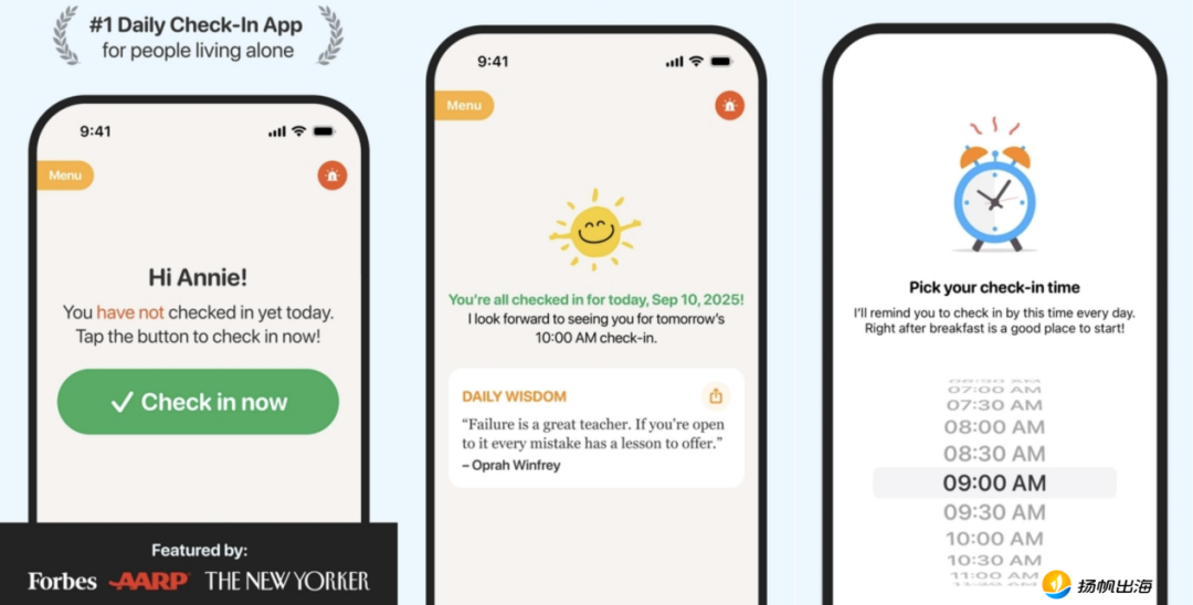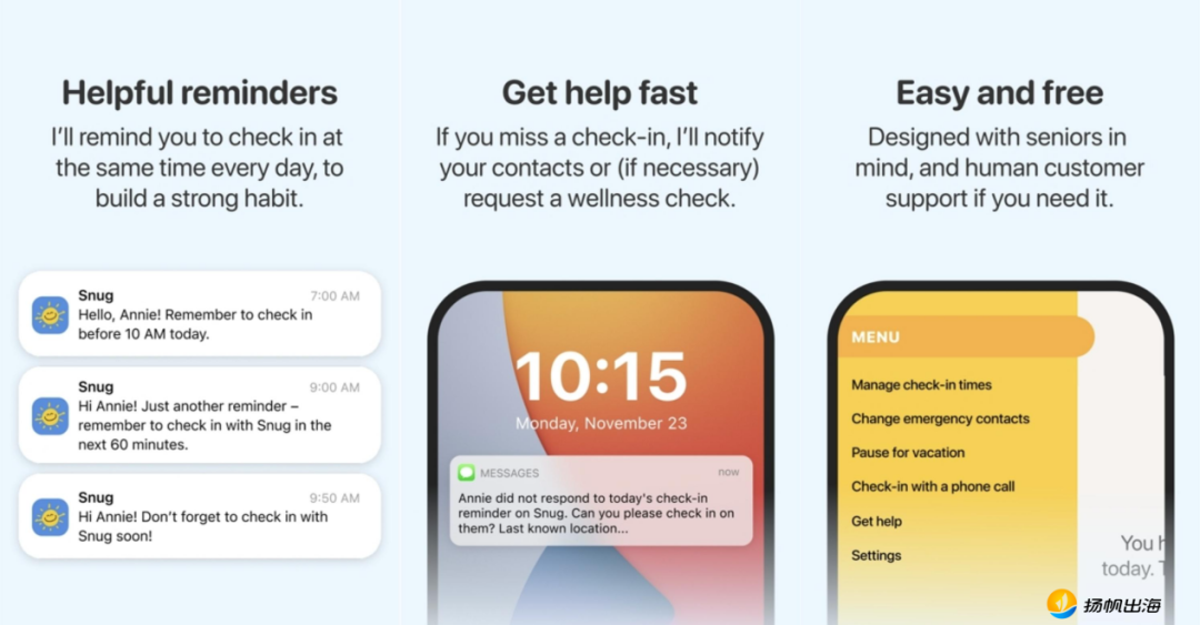 Snug Safety于2016年推出,目前仅服务于美国地区的独居人群,核心功能同样围绕“每日安全签到”展开,且签到功能免费。官方去年曾公开表示,希望将这一模式推广至更多国家及地区。
