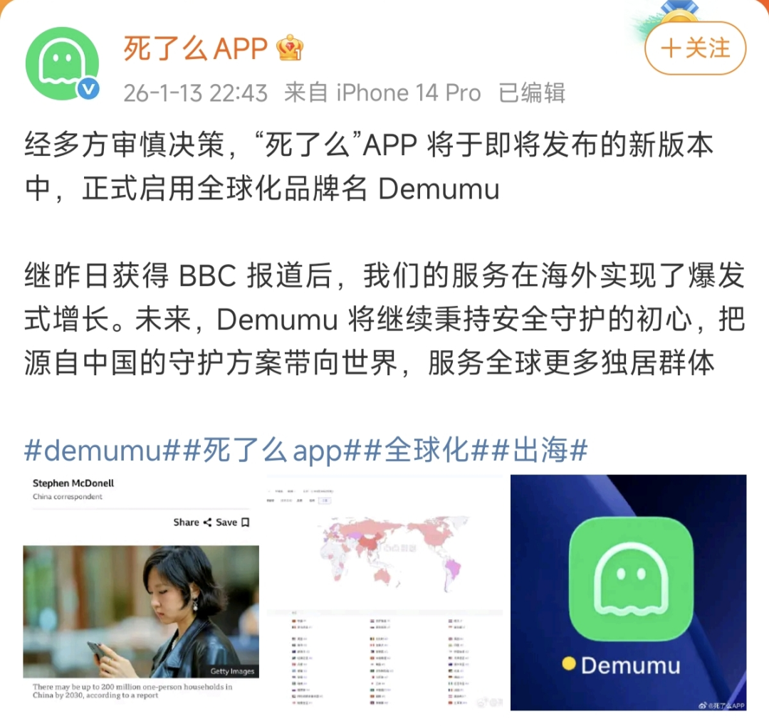 目前看来,“死了么”App的这波“热潮”,开始烧往海外。1月13日,官方宣布正式启用全球化品牌名“Demumu”,并借势BBC报道的海外关注度,启动产品与服务的出海布局。