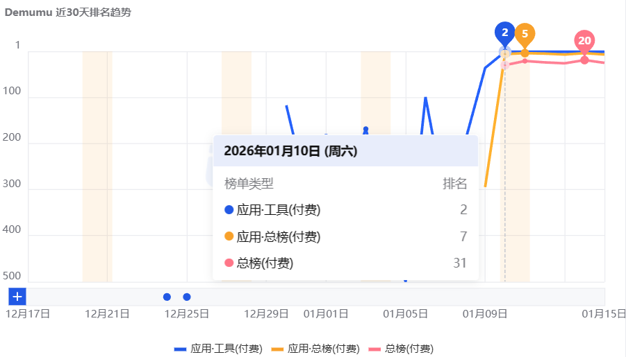 从榜单表现来看,Demumu于1月10日登上美国地区iOS商店工具类应用付费榜第2,截至1月15日,其位于应用付费榜第8名。